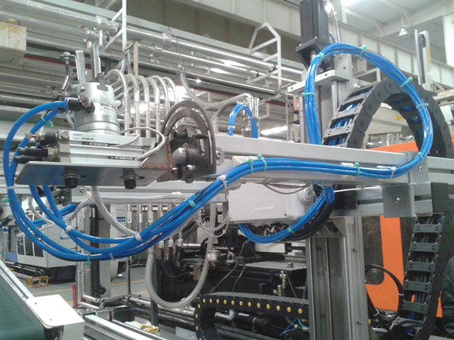 2014年10月,我們成功為格力電器公司研發(fā)出一款可以自動抓取風葉進行動平衡檢測的機械手?照{(diào)外機的風葉經(jīng)注塑機注塑成型后由機械臂取出并放置到皮帶線上送走。機械手和注塑機配合,定期接取風葉放置到動平衡機上進行抽檢,合格后自動抓取放回皮帶線,不合格則報警提示。